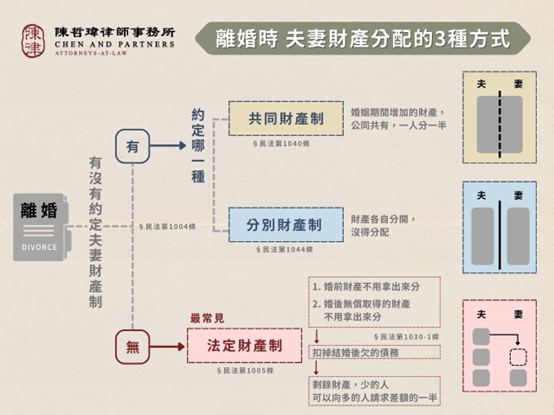 - 而「分別財產制」則是夫妻各保有各自財產之所有權,各自管理、使用、收益及處分。因此離婚時也不需要分配財產給對方。