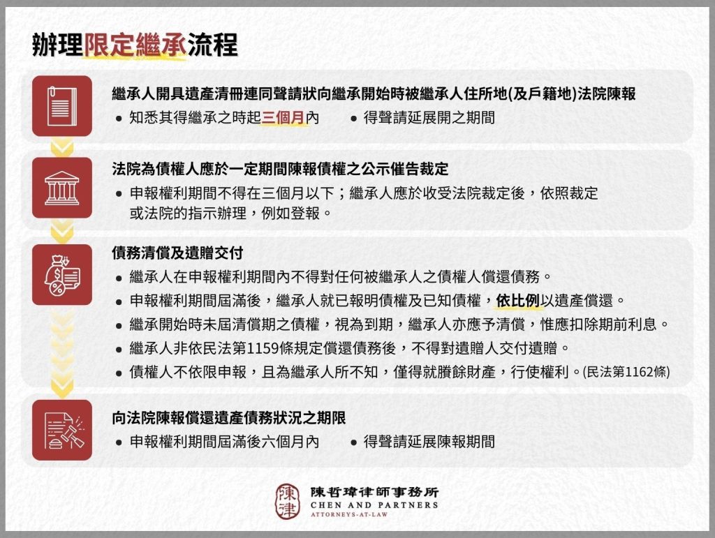 - 在被繼承人死亡的「三個月內」,繼承人開具「遺產清冊」連同「聲請狀」,向被繼承人戶籍地的法院陳報,並附上「被繼承人之除戶謄本」、「所有繼承人之戶籍謄本」、「繼承系統表」、「繼承人名冊」。